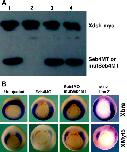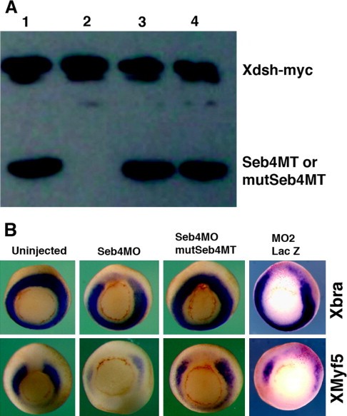 Fig. 5. Effectiveness and specificity of Seb4MO. (A) Western blot analysis. Seb4MT (lanes 1 and 2) or mutSeb4MT (lanes 3 and 4) mRNA was coinjected with CoMO (lanes 1 and 3) or Seb4MO (lanes 2 and 4). Xdsh-myc mRNA was coinjected as an unrelated mRNA in each condition and used as a loading control. CoMO has no effect on Seb4MT translation (lane 1), while Seb4MO completely blocks Seb4MT translation (lane 2), but not the coinjected Xdsh-myc mRNA. Neither CoMO (lane 3) nor Seb4MO (lane 4) has any effect on mutSeb4MT translation. (B) Coinjection of mutSeb4MT mRNA rescues Seb4MO-inhibited Xbra and XMyf5 expression in whole embryos at the early gastrula stage, and MO2 similarly inhibits Xbra and XMyf5 expression as Seb4MO.