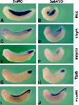 Fig. 4. Knockdown of Seb4 inhibits myogenesis. In situ hybridization using indicated probes was performed on embryos injected with CoMO or Seb4MO and cultured to stage 30. (A) Myosin light chain (MLC) expression in the somitic mesoderm of a CoMO-injected embryo. (B) A Seb4MO-injected embryo with reduced and disorganized somitic mesoderm. (C) XMyf5 expression in a CoMO-injected embryo. (D) Injection of Seb4MO inhibits XMyf5 expression in the anterior and trunk region. (E) XMyoD expression in a CoMO-injected embryo. (F) Injection of Seb4MO inhibits XMyoD expression. (G) Tbx6 expression in the tail-bud of a CoMO-injected embryo. (H) Injection of Seb4MO reduces the expression level of Tbx6 in the tail-bud. (I) HoxB9 expression in the spinal cord of a CoMO-injected embryo. (J) Injection of Seb4MO does not significantly affect HoxB9 expression.