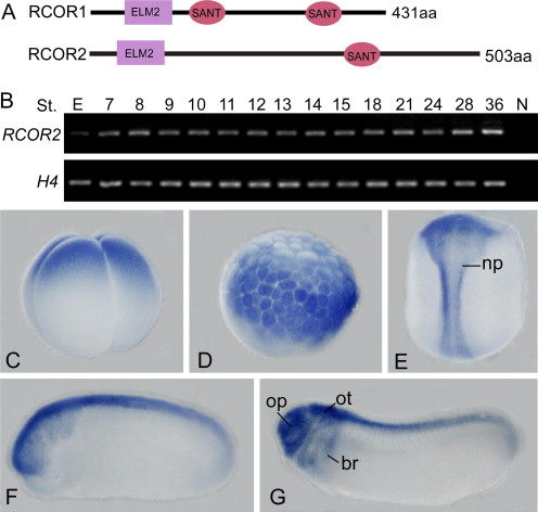 Fig. 1. Temporal and spatial expression patterns of Xenopus RCOR2. (A) The schematic structures of XRCOR1 and XRCOR2. (B) RT-PCR analysis of the developmental