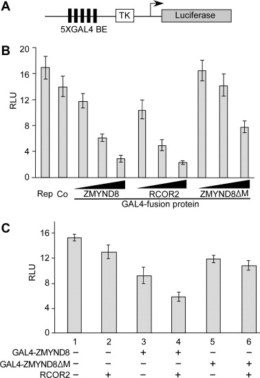 RCOR2, and GAL4-ZMYND8–4MYND (4M in the figure) plasmids. Rep, reporter