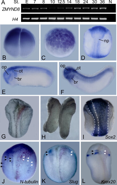 the top. np, neural plate. (E) Stage 25, lateral view, anterior to the left. br, branchial arches; op, optic vesicle; ot, otic vesicle. (F) Stage 30, lateral view, anterior to the left. (GâL)