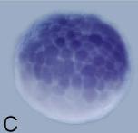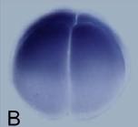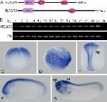 Whole-mount in situ hybridization analysis of XZMYND8. (B) Four-cell stage, animal pole to the top. (C) Stage 8, animal pole to the top. (D) Stage 15, dorsal view, anterior to