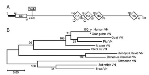 Fig. 1.Xenopus laevis vitronectin structure. (A) Domain structural organization of Xenopus laevis vitronectin. The predicted amino acid sequence of X. laevis vitronectin was analyzed with SMART software. Abbreviations correspond to the conserved somatomedin B (SO) and hemopexin-like (HX) domains. RGD tripeptides are signed. Hexagonalsymbols designate Asn residues that are potential N-glycosylation sites. Numbers indicate the first/last residues. (B) Phylogenetic tree of vitronectin proteins composed from various species: HVN (human vitronectin, AAH05046), OVN (orangutan vitronectin, CAI29588), GVN (goat vitronectin, ABA27428), PVN (pig vitronectin, NP_999269), MVN(mouse vitronectin, AAA40558), CVN (chicken vitronectin, NP_990392), XlVN (African clawed frog vitronectin, ACI29973), XtVN (Xenopus vitronectin, AAH89081), TVN (tetraodon vitronectin, CAG08847), ZVN (zebrafish vitronectin, AAH55570), and TVN (trout vitronectin, CAJ57657). The relationships among the various orthologs were analyzed by the neighbour-joining algorithm within MEGA version 4. Branch points were validated by 1000 bootstrap replications.