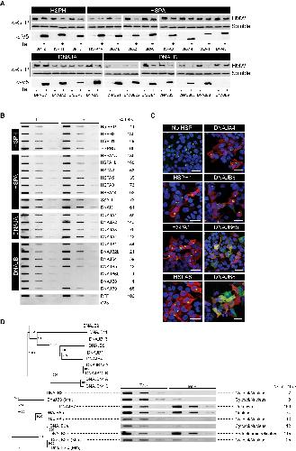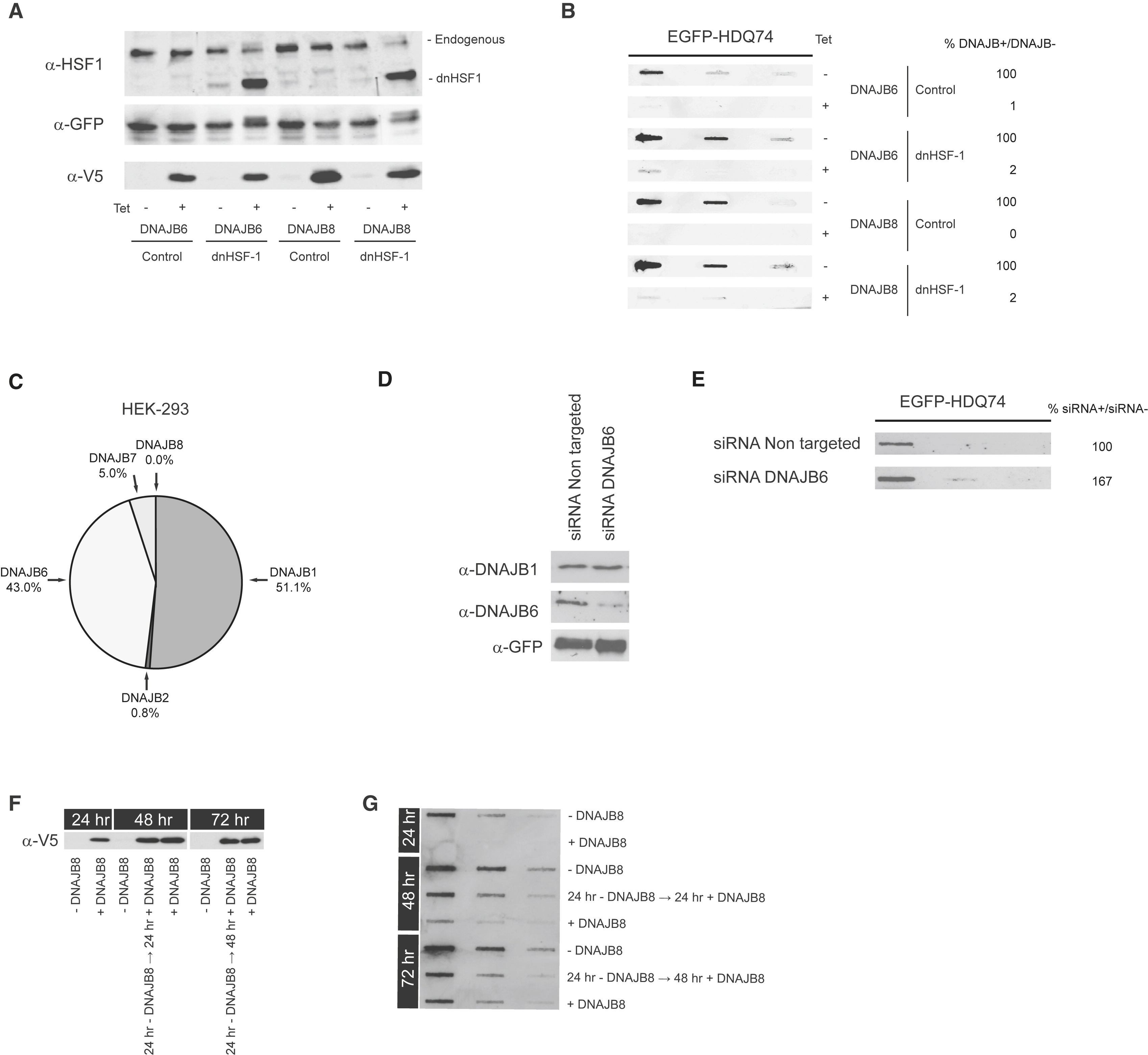 (A and B) Western blot (A) and filter trap (B) analysis on cell lysates coexpressing a tetracycline-inducible dominant-negative HSF-1 (dnHSF1; probed with an HSF-1 antibody), HDQ119-EYFP (GFP antibody), and DNAJB6b or DNAJB8 (anti-V5 antibody).