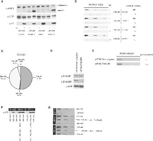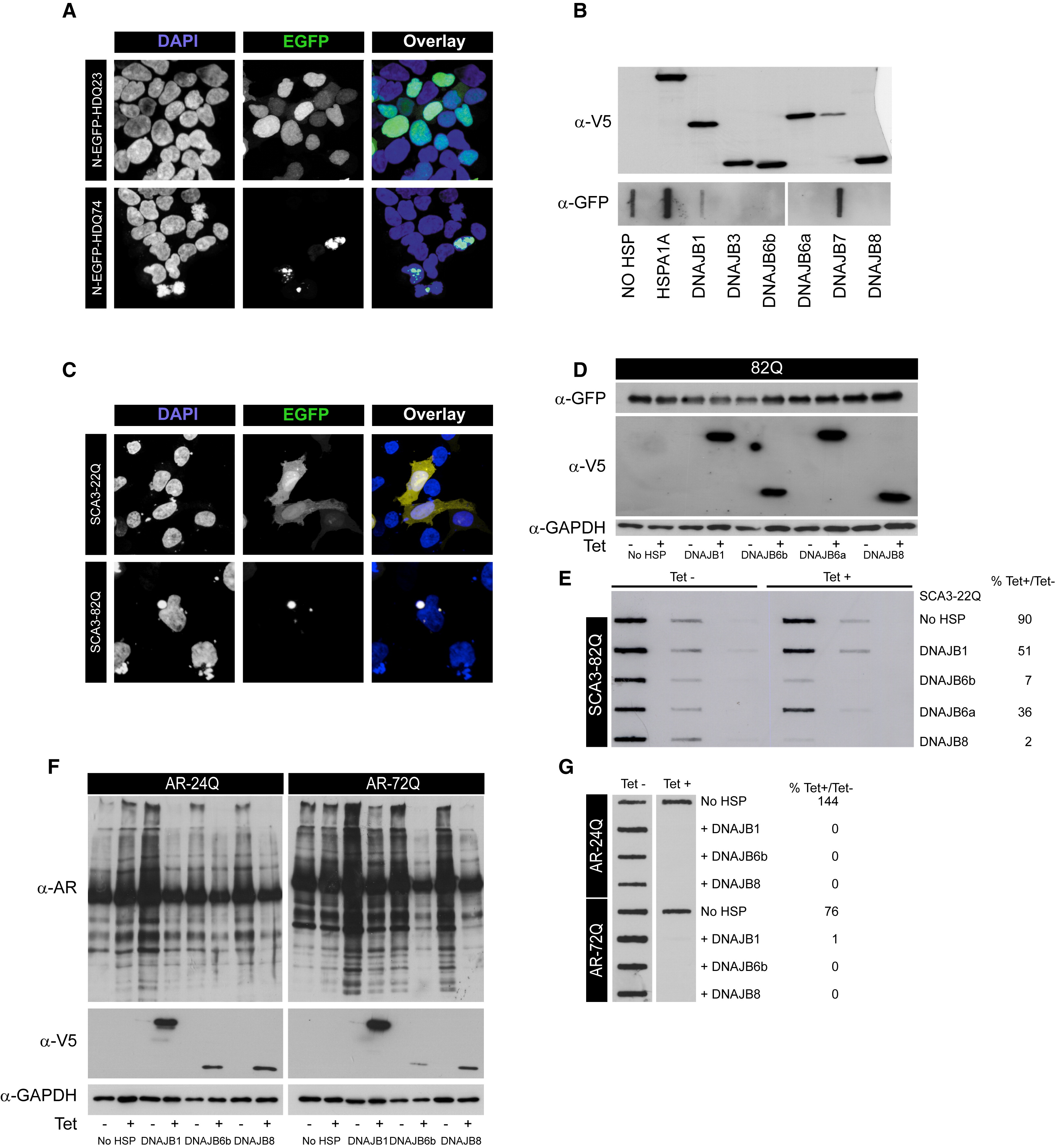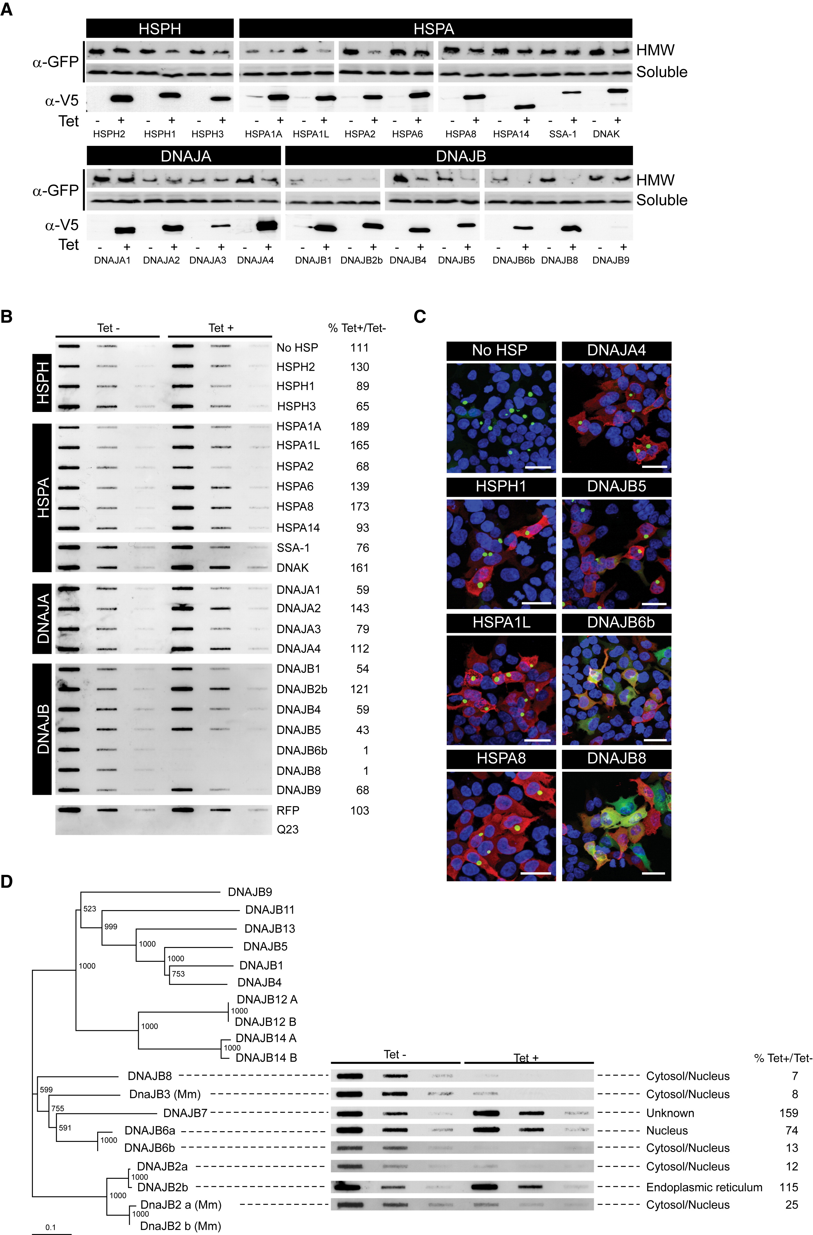 (A) Cells were cotransfected with HDQ119-EYFP and V5-tagged members of the HSPH, HSPA, or DNAJ families. Expression of chaperones was induced with tetracycline. Samples were taken 24 hr after transfection. High-molecular-weight (HMW) aggregates trapped in the stacking gel and soluble HDQ119-EYFP were assessed with anti-GFP antibodies. Expression of chaperones was detected with anti-V5 antibodies.
