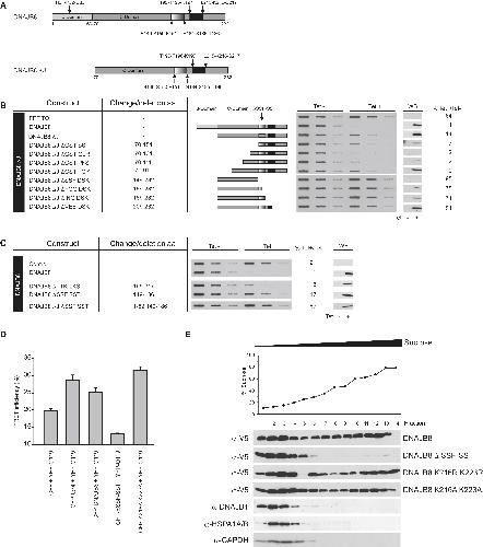 (E) Sucrose density gradient fractionation of lysates of cells expressing DNAJB8 wild-type and mutant variants as indicated. DNAJB8 and its mutants were detected using anti-V5 antibody, whereas endogenous DNAJB1 and HSPA1A/B were detected with DNAJB1- or HSPA1A/B-specific antibodies.