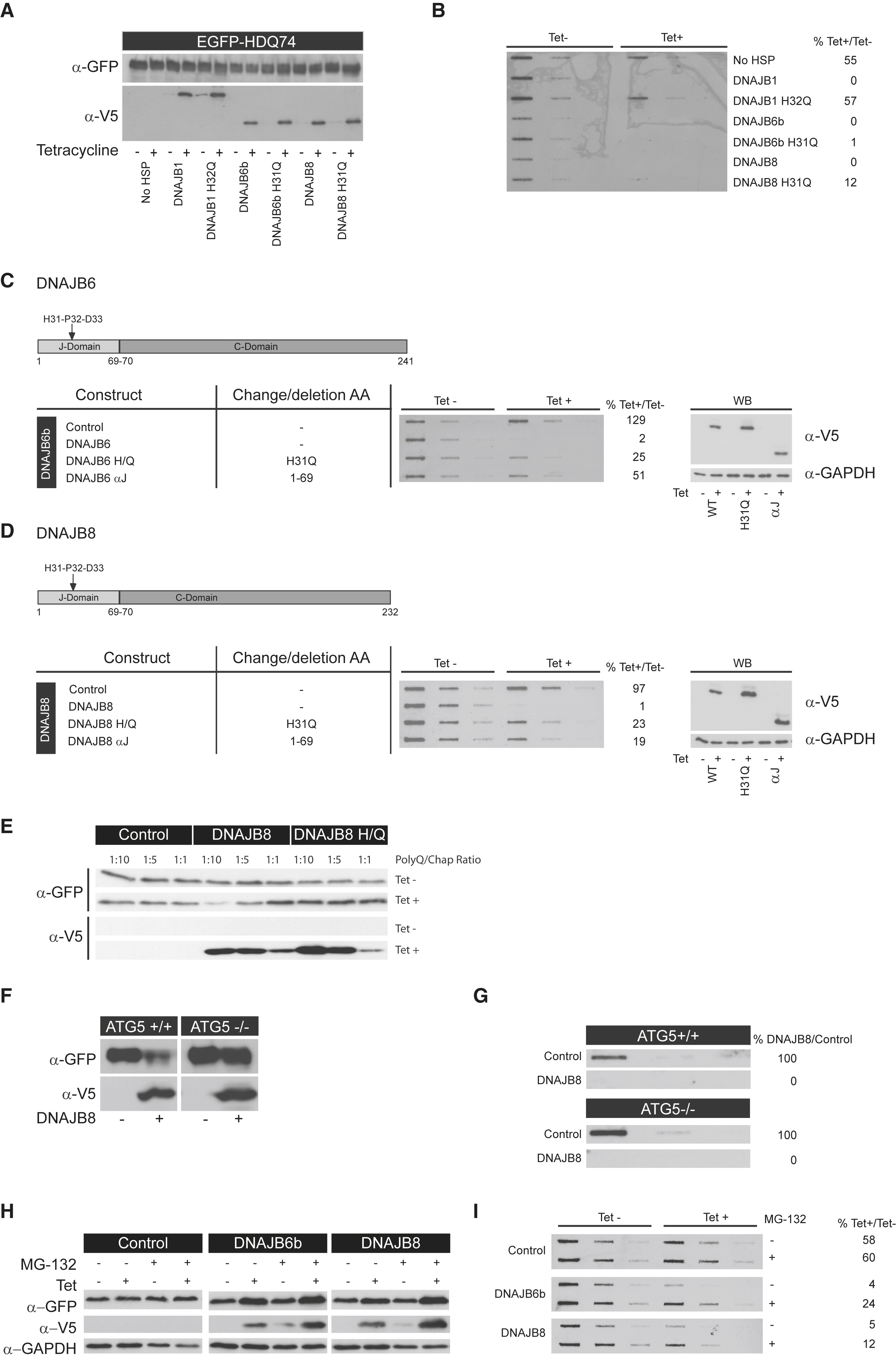 (F and G) Western blot (F) and filter trap (G) analysis on HDQ119-EYFP aggregation in ATG5+/+ and ATG5−/− MEFs with or without coexpression of DNAJB8.