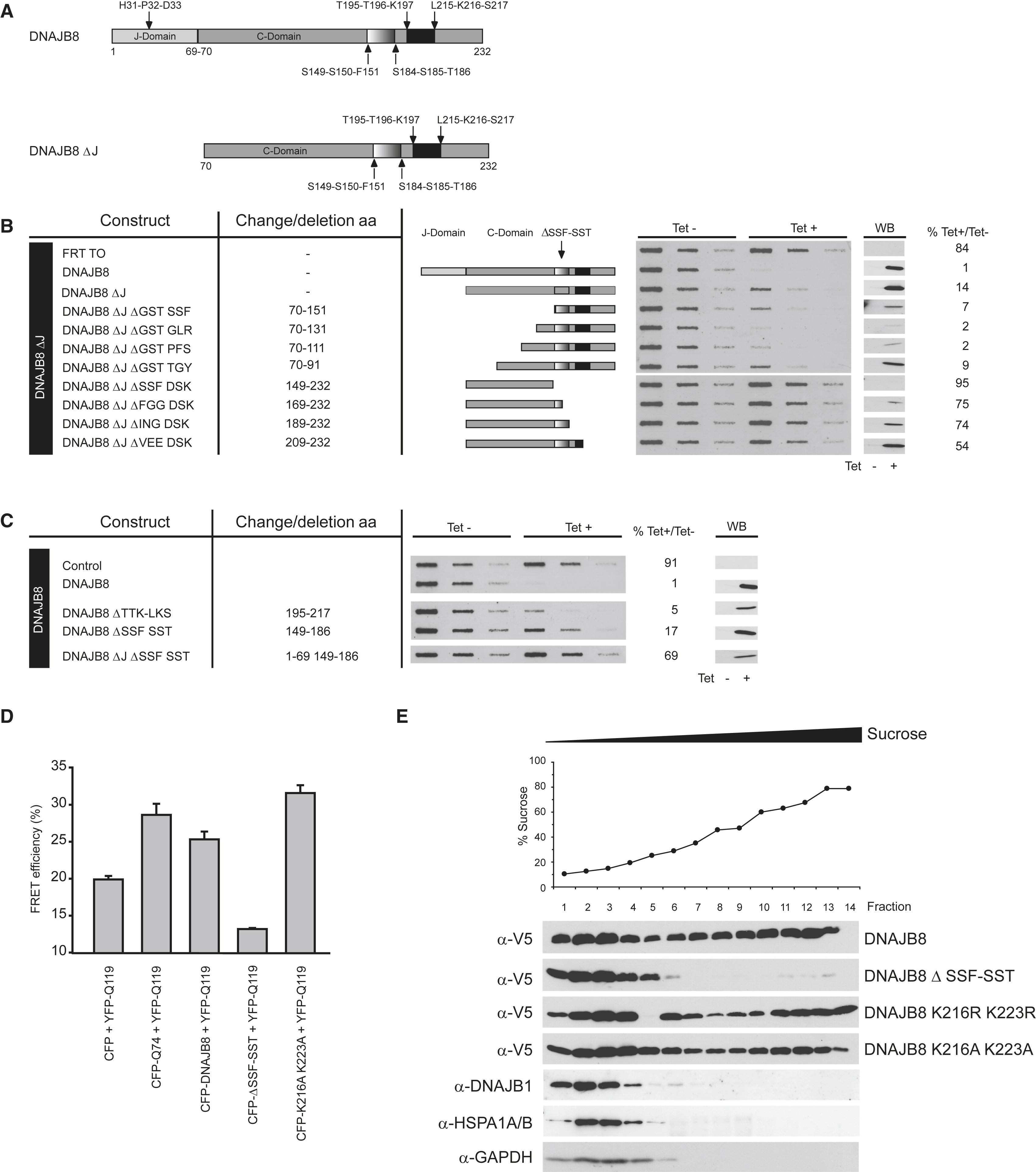 (D) Cells transfected with YFP-HDQ119 and CFP-tagged DNAJB8 wild-type and mutant variants as indicated were analyzed for fluorescence resonance energy transfer (FRET) using fluorescence lifetime (FLIM) analysis; data are mean ±SD (N > 9 individual cells).