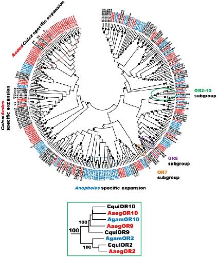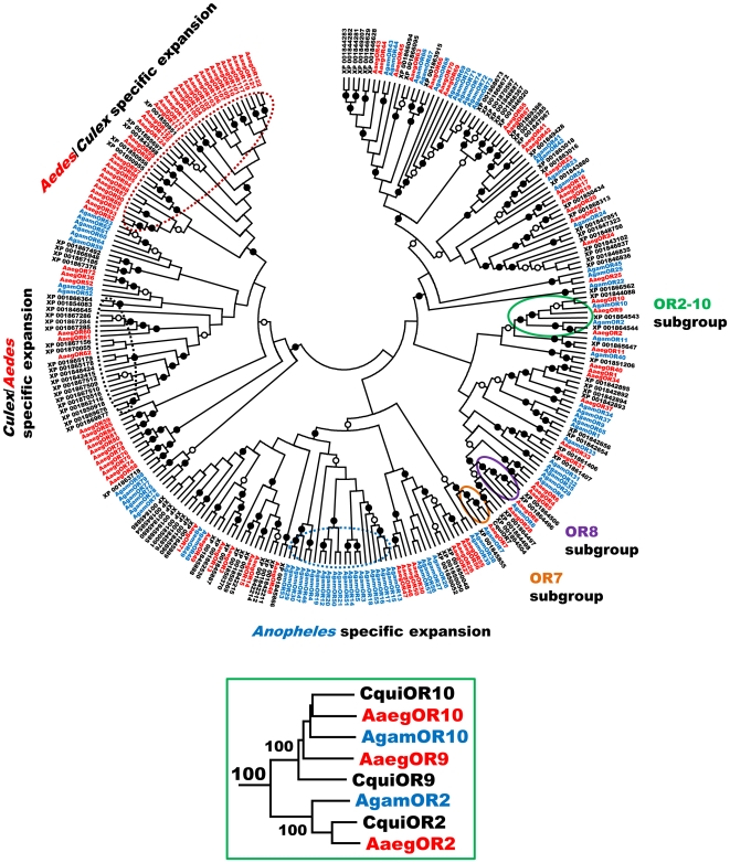 Figure 1. Phylogenetic relationships of mosquito ORs.Culex ORs are in black, Anopheles ORs are in blue and Aedes ORs are in red. Filled circles and empty circles represent 94–100% and 79–93% bootstrap support, respectively. The green box represents relationships in the conserved OR2-OR10 subgroup. CquiOR2 corresponds to (XM_001864509/XP_001864544), CquiOR9 to (XM_001864508/XP_001864543) and CquiOR10 to (XM_001844036/XP_001844088). Major species-specific expansions and conserved OR7 and OR8 subgroups are indicated.