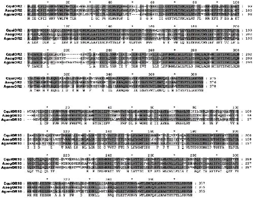 Figure 2. Alignment of mosquito OR2 and OR10 amino acid sequences.Dark grey and light grey shading indicate residues conserved among three species and between two of the three species, respectively.