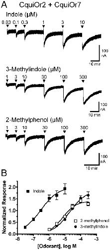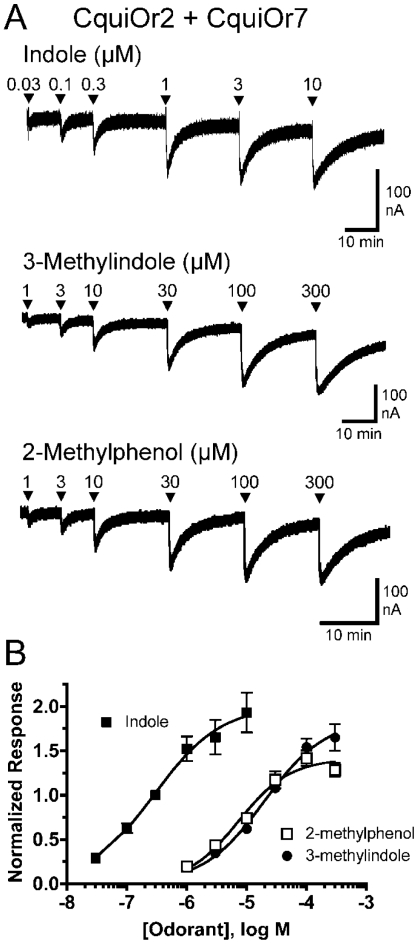 Figure 5. CquiOR2 + CquiOR7 is highly responsive to indole.A) Upper trace, an oocyte expressing CquiOR2 + CquiOR7 is challenged with 20 s applications of a range of concentrations of indole. Middle trace, an oocyte expressing CquiOR2 + CquiOR7 is challenged with 20 s applications of a range of concentrations of 3-methylindole. Lower trace, an oocyte expressing CquiOR2 + CquiOR7 is challenged with 20 s applications of a range of concentrations of 2-methylphenol. B) Concentration-response relationships for CquiOR2 + CquiOR7 expressing oocytes when activated with a range of indole, 3-methylindole and 2-methylphenol concentrations. All data are normalized to the response of each oocyte to 300 nM indole and the curves were fit as described in Materials and Methods (means ± SEM; n = 5–16). EC50 and nH values are provided in Table 1.