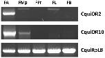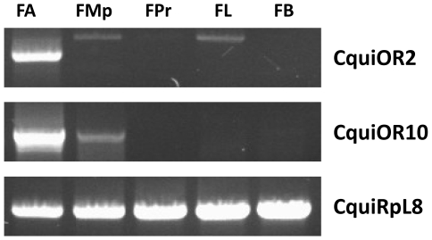 Figure 3. Expression profiles of two ORs in Cx. quinquefasciatus female tissues by RT-PCR.Olfactory tissues: antennae (FA); maxillary palps (FMp); proboscis (FPr). Non olfactory tissues: legs (FL); bodies (FB). CquiRpL8 was used as control gene.