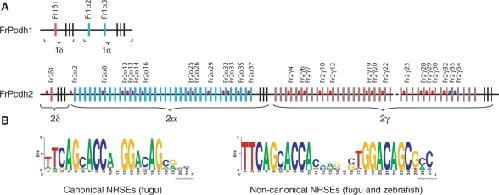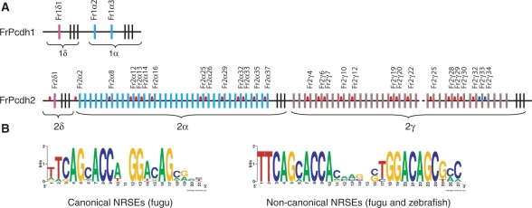 Figure 1. NRSEs in fugu protocadherin clusters. (A) Fugu protocadherin clusters. Colored vertical bars represent individual variable exons, whereas the black vertical bars at the 3′-end of each subcluster represent the constant exons. Red and blue ovals in the intergenic regions represent canonical and non-canonical NRSEs, respectively. The dotted line in the fugu Pcdh2 cluster indicates an undetermined sequence gap. Fr: Fugu rubripes. (B) WebLogo display of the consensus sequence of canonical (left panel) and non-canonical (right panel) NRSEs. Note: the non-canonical NRSE consensus is a combination of both fugu and zebrafish elements. |