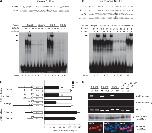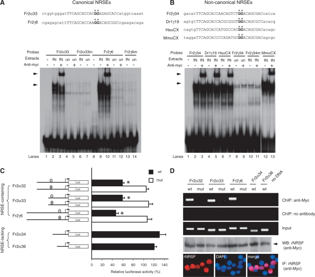 Figure 2. Functional assay of NRSEs in the fugu protocadherin cluster. EMSA for canonical (A) and non-canonical (B) NRSEs. The NRSE sequences are indicated by upper-case letters whereas the flanking sequences are indicated by lower-case letters. The asterisks indicate the critical guanine dinucleotide that was mutated to adenine nucleotides in NRSE mutants. Arrows in the autoradiography indicate the protein–oligonucleotide complex of the full-length fugu NRSF/REST (A: lanes 2 and 9; B: lanes 2, 4, 6 and 12), or the super-shifted complex in the presence of the anti-Myc antibodies (A: lanes 3 and 10; B: lanes 3, 5, 7 and 13). fN: nuclear extracts from pCMVmyc-fNRSF-transfected HEK293 cells; un: nuclear extracts from mock (pCMVmyc) transfected HEK293 cells. Fr2α33m, Fr2γ6m and Fr2γ34m represent the corresponding mutant NRSE oligonucleotides of Fr2α33, Fr2γ6 and Fr2γ34, respectively. HsαCX and MmαCX represent the NRSEs located in the constant regions of the human and mouse protocadherin α clusters. (C) Relative luciferase activity of Neuro2A stable cell lines harboring individual fugu protocadherin promoter-luciferase reporter cassettes. The solid bars represent the wild-type fugu protocadherin promoters, whereas the open boxes represent the mutant forms. The relative luciferase activity was calculated by the activity of the pCMVmyc-rNRSF-transfected cells over the mock plasmid transfected cells after normalization for the protein concentration. (D) ChIP assay showing that the ectopically-expressed NRSF/REST binds to the wild-type NRSE-containing promoters (Fr2α32, Fr2α33 and Fr2γ6), but not the mutant (Fr2α32mut, Fr2α33mut and Fr2γ6mut) or NRSE-lacking (Fr2α34 and Fr2α36) promoters. The expression of rat NRSF/REST was confirmed by western blot and immunostaining with anti-Myc antibody. |