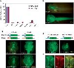 Figure 3. NRSEs are responsible for the neuronal specificity of fugu protocadherin promoters. (A) The expression profile of fugu Pcdh2α and Pcdh2γ subcluster genes determined by real-time RT-PCR. The relative protocadherin expression level in each tissue is displayed as a percentage of the expression level in the brain after normalization by actin expression. (B) NRSE-containing protocadherin promoters: red ovals represent the wild-type NRSE, whereas blank ovals with a cross represent the mutant NRSEs. Images of transgenic tadpoles (9â10 days post-fertilization) harboring the wild-type (left panels) and mutant (right panels) protocadherin promoter-EGFP constructs. Upper panels: Fr2α33-EGFP; lower panels: Fr2γ6-EGFP. (C) Comparison of the NRSE-containing and NRSE-lacking protocadherin promoters: the whole body images of transgenic tadpoles (9â10 days post-fertilization) harboring a fugu NRSE-containing (Fr2α33, upper panel) or an NRSE-lacking (Fr2α36, lower panel) protocadherin promoter-EGFP showing that the NRSE-containing promoter directs EGFP expression specifically to the nervous system, whereas the NRSE-lacking promoter directs the transgene expression to both neuronal and non-neuronal tissues. (D) NRSE-lacking protocadherin promoters: images of transgenic tadpoles harboring NRSE-lacking Fr2α36-EGFP transgene in the absence (left panel) and presence (right panel) of an NRSE inserted at the 3â²-end of EGFP coding sequence. (E) The transverse section of the brain/spinal cord region of transgenic tadpole harboring the Fr2α33-EGFP showing that the EGFP expression is predominantly neuronal. Left panel: EGFP florescence image; Middle panel: anti-neuron-specific tubulin βIII (TuJ1); Right panel: merged. |