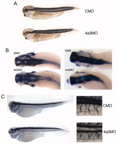 Figure 5. Somite and neuronal development in Eif4a3 morphants. A: 12/101 antibody staining of somitic mesoderm in embryos injected with Eif4a3MO (4a3MO) or a control (scrambled) morpholino (CMO). No differences in somite staining were observed between the two populations. B: Whole-mount in situ hybridization with antisense probes against elrC (left) or sox3 (right) in embryos injected with Eif4a3MO (4a3MO) or Eif4a3MM (5MM). Note slight expansion of anterior neural tube in Eif4a3 morphants. C: Left panels: 3A10 antibody staining of neurons in embryos injected with Eif4a3MO (4a3MO) or a control (scrambled) morpholino (CMO). Right panels: High magnification of trunk detail of embryos at left. Note disorganization of âYâ-shaped motor neuron bundles in Eif4a3 morphants.