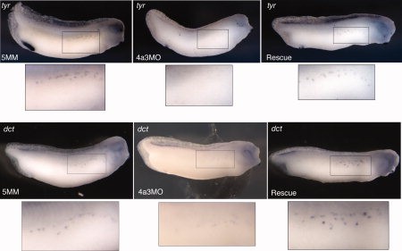 Figure 7. Eif4a3 is required for expression of tyrosinase genes. Whole-mount in situ hybridization with antisense probes against tyrosinase (tyr) (top panels) or tyrosinase-related protein-2 (dct) (bottom panels) in embryos injected with Eif4a3MO (4a3MO), Eif4a3MM (5MM), or Eif4a3MO+2 ng eif4a3 RNA (Rescue). With both probes, intensity of signal and number of positive cells were reduced in Eif4a3 morphants at tailbud stages; this effect was rescued by co-expression of eif4a3 RNA.