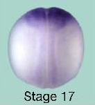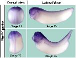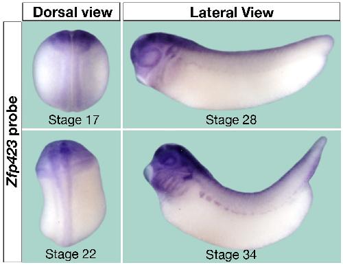 Supplemental Figure 2. Zfp423 expression during Xenopus laevis development. Whole mount in situ hybridization analysis of Zfp423 gene expression in embryos at different stages of development (stage 17 and 22, dorsal view; stage 28 and 34 lateral view). |