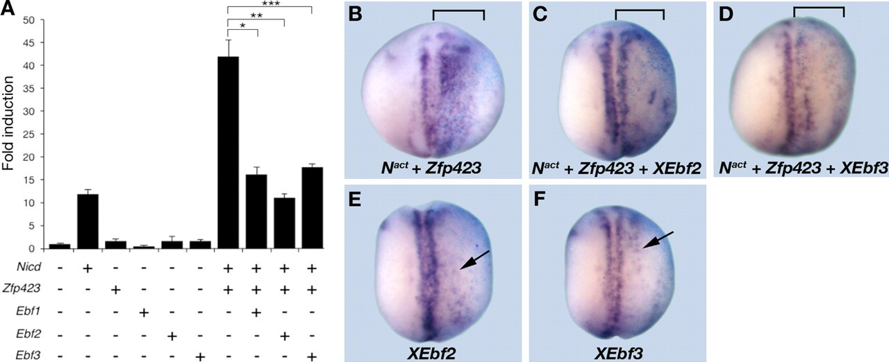FIGURE 6. EBF TFs reduce ZFP423-NICD-mediated Hes5 gene expression in vitro and in vivo. A, RT-qPCR analysis of Hes5 gene expression in P19 cells transfected with the indicated constructs. Note that Ebf1, Ebf2, or Ebf3 alone does not affect basal Hes5 expression. B, whole mount in situ hybridization analysis of ESR1 gene expression in embryos injected unilaterally (bracket) with Nact (100 pg) and Zfp423 (600 pg) and/or XEbf2 (100 pg) or XEbf3 (100 pg). E and F, whole mount in situ hybridization analysis of ESR1 gene expression in embryos injected unilaterally with XEbf2 (100 pg) or XEbf3 (100 pg), as indicated. Note slightly increased ESR1-positive cells in XEbf2- and XEbf3-injected embryos (arrow). B, LacZ (blue stain) serves as an indicator of the injected side. |