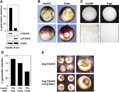 Fig. 7. Cdc25C overexpression disrupts gastrulation. (A,B) The two dorsal blastomeres of four-cell embryos were injected with β-gal RNA (4 ng) or co-injected with β-gal (100 pg) and His-Cdc25C (3 ng) and embryos were scored for gastrulation defects at stage 11.5-12. Number of embryos examined: Cdc25C (n=141), β-Gal (n=162). (A, lower panels) Stage 10.5-11 embryo lysates were examined by immunoblot analysis using anti-His-epitope, Cdc2 and phospho-Cdc2 antibodies. (C) Following injection as in A, mitotic nuclei of stage 11 embryos were visualized. Mitotic index (n=10-12 embryos): β-gal, 8.3% (6928 nuclei), Cdc25C, 28.1% (5550 nuclei). (D,E) Embryos were injected with 4 ng of Cdc25C RNA and either 0, 0.2 or 0.5 ng of Wee1 RNA. Number of embryos examined: Cdc25C + 0 ng Wee1 (n=74), Cdc25C + 0.2 ng Wee1 (n=100) and Cdc25C + 0.5 ng Wee1 (n=86). Note that increased expression of Wee1 counteracts the defects induced by Cdc25C overexpression.