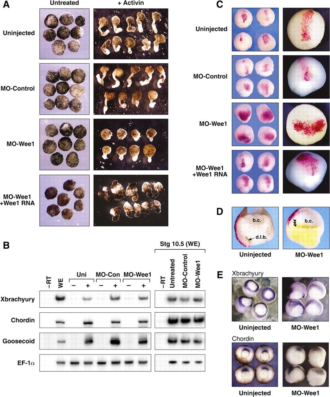 Fig. 3. Wee1 depletion inhibits morphogenesis but not zygotic gene expression. (A) Animal cap explants prepared from uninjected embryos and embryos injected with MO-Control, MO-Wee1 or MO-Wee1+WT Wee1 RNA were left untreated or were treated with activin and cultured until stage 22-23. (B) RNA was isolated from animal cap explants prepared as in A and from stage 10.5 whole embryos (WE) that were either uninjected or had been injected with Control-MO or MO-Wee1 at the two-cell stage. Expression of brachyury, goosecoid and chordin was examined by RT-PCR analysis. cDNA levels were normalized to EF-1α, and a sample lacking reverse transcriptase (âRT) was also included. (C) Two-cell embryos were injected with MO-control, MO-Wee1 or MO-Wee1 + WT RNA. β-Gal RNA was injected into the B1 blastomeres at the 32-cell stage and β-gal activity visualized at stage 11.5-12. The B1 clone forms a narrow midline band extending between the blastopore (bottom) and animal hemisphere (top) in uninjected (n=12) and MO-Control injected embryos (n=23), while the B1 progeny form a broad band across the dorsal equator in MO-Wee1 embryos (MO-Wee1; n=36). this defect is significantly reversed by co-injection of WT Wee1 RNA (MO-Wee1+WT RNA; n=16). (D) The embryos shown in C were bisected through the area of β-gal staining. In uninjected embryos, the labeled cells extend from the animal hemisphere (top) to the dorsal blastopore lip (dbl). In Wee1-depleted embryos (MO-Wee1), no epibolic spread towards the vegetal pole (bottom) or involution occurs. However, some of the inner vegetal cells have moved upwards along the inner surface of the blastocoel roof (b.c.; arrow heads). (E) Expression of Xbrachyury (upper two panels, MO-Wee1, n=67) and chordin (MO-Wee1, n=54, lower two panels) was determined by in situ histochemistry (blue staining).