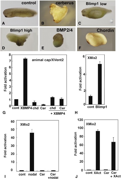 Fig. 7. Experiments in Xenopus show conserved protein functions. (AâF) Injections into marginal zones of 4-cell Xenopus embryos except for B. (A) Uninjected control. (B) 10 pg/cell amphioxus Cerberus mRNA in D4 blastomere at 32 cell stage induces secondary axis. (C) 100 pg/cell amphioxus Blimp1 mRNA expands ventral structures. (D) 500 pg/cell amphioxus Blimp1 mRNA reduces head structures and expands ventral ones. (E) 100 pg/cell amphioxus BMP2/4 mRNA ventralizes. (F) 10 pg/cell amphioxus Chordin mRNA enlarges the cement gland. (GâJ) Assays of amphioxus proteins in Xenopus animal caps. (G) BMP responsive reporter assay. Amphioxus Chordin and Cerberus suppress signaling by Xenopus BMP4, as monitored by transcription from an Xvent2 reporter. (H) Amphioxus Blimp1 induces transcription from a Nodal-responsive (Xmix2) reporter construct. (I) Nodal-responsive assay. Amphioxus Cerberus suppresses amphioxus Nodal. (J) Activin response assay. Amphioxus Cerberus suppresses Xenopus Activin signaling. Experiments done twice with comparable results; error bars ± 1 s.d. |