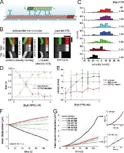Figure 2. Competition of antagonistic motors in antiparallel microtubule sliding. (A) Scheme of a pair of polarity-marked microtubules in a sliding assay (symbols as in Fig. 1 A). (B) Different motility states of microtubule pairs. Example kymographs of a freely movable Alexa Fluor 568–microtubule (MT; green) bound via motor cross-links to a surface-immobilized Cy5-microtubule (red) in the presence of 0.5 nM XCTK2 and 0.66 nM Eg5-GFP, illustrating Eg5-dominated unidirectional antiparallel sliding, XCTK2-dominated unidirectional antiparallel sliding, movement with unstable directionality, and static parallel binding (from left to right). All kymographs are taken from the same sample. (C) Histograms of the instantaneous velocities of antiparallel sliding microtubules during the competition between 0.5 nM XCTK2 and varying concentrations of Eg5 (indicated to the right). Histograms contain all data of three independent experiments. (D) Fractions of Eg5-GFP– and XCTK2-dominated movement during microtubule sliding, calculated as described in Materials and methods. (E) Mean velocities of all microtubule movements and mean velocities separately determined for only the XCTK2-dominated microtubule movements and for the Eg5-GFP–dominated movements compiled from C. (F) Mean displacement curves of antiparallel sliding microtubules during the competition. Color code as in C and G. The highest, the lowest, and the balance point Eg5 concentrations are emphasized by thick lines. (G, left) MSD curves of antiparallel sliding microtubules. (top right) MSD curve of antiparallel sliding microtubules in the presence of 0.5 nM XCTK2 (black) fitted with a parabolic function (red). (bottom right) MSD curve of antiparallel sliding microtubules in the presence of 0.5 nM XCTK2 and 0.66 nM Eg5-GFP (black) fitted with a parabolic function (from 0 to 36 s; red) and a linear function (from 36 s onward; blue). The dashed lines show continuations of the fit equation in the data range that was not used for the fit. Error bars in D and E are standard errors of the mean. Dotted lines in F and G are 95% confidence intervals. All experiments shown were performed in assay buffer containing 50 mM KCl. Bars: (B, horizontal) 5 µm; (B, vertical) 120 s.