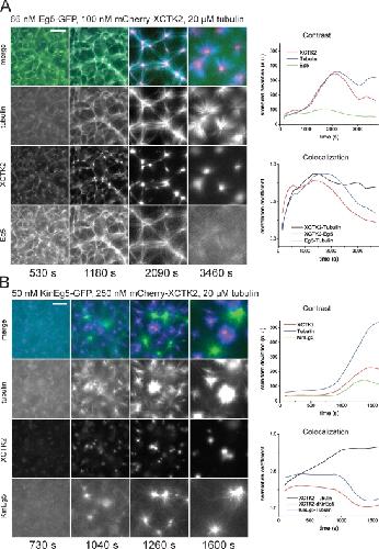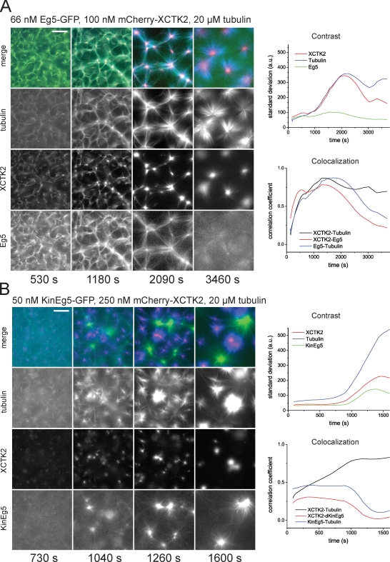 Figure 5. Self-organization of microtubules and antagonistic mitotic motors. (A) Competition between XCTK2 and wild-type Eg5 in self-organization of microtubules and motors. (left) Time course of the self-organization of mCherry-XCTK2 (red), Eg5-GFP (green), and Cy5-tubulin (blue) into asters with centrally accumulated mCherry-XCTK2; concentrations are as indicated. (right) Time course of self-organization as monitored by image parameters as in Fig. 4 A for the color channels as indicated. (B) Competition between XCTK2 and chimeric Kin-Eg5 in self-organization of microtubules and motors. (left) Time course of the self-organization of mCherry-XCTK2 (red), Kin-Eg5–GFP (green), and Cy5-tubulin (blue) into separate mCherry-XCTK2–containing asters and Kin-Eg5–GFP-containing asters; concentrations are as indicated. (right) Time course of self-organization as monitored by image parameters. All experiments shown were performed in assay buffer containing 50 mM KCl. a.u., arbitrary unit. Bars, 50 µm.