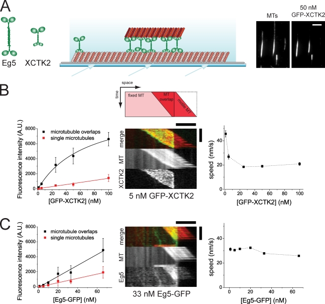 Figure 1. GFP-XCTK2 accumulates between microtubule pairs in contrast to Eg5-GFP. (A, left) Schematic representations of the molecular architectures of tetrameric plus end–directed motor Eg5 and dimeric minus end–directed motor XCTK2. Large round and small rectangular symbols indicate motor domains and nonmotor microtubule binding domains, respectively. (middle) Scheme of a microtubule pair in the sliding assay. Long, dimly fluorescently labeled, biotinylated microtubules are attached to a biotin-PEG–coated (gray) glass surface via neutravidin links. Short, brightly fluorescently labeled, unbiotinylated microtubules (top) are bound to the immobilized microtubules via cross-linking motor proteins. The arrows on the bottom indicate the incidence angle of the excitation light, which is totally internally reflected and gives rise to an evanescent field (light blue gradient). (right) TIRF microscopy images of Cy5-labeled microtubule (MT) pairs cross-linked by GFP-XCTK2 present in solution at a concentration of 50 nM, illustrating accumulation of GFP-XCTK2 in microtubule overlaps. (B) Quantification of GFP-XCTK2 in Cy5-microtubule pairs in assay buffer containing 120 mM KCl. (left) Binding curves showing averaged TIRF intensities of GFP-XCTK2 along microtubule overlaps and single microtubules at varying concentrations of GFP-XCTK2. The error bars are standard deviations, indicating the width of the fluorescence intensity distribution. The Kd for the binding of GFP-XCTK2 to the microtubule overlap derived from the fit is 69 ± 15 nM (error is standard error of the mean). (middle) Dual-color kymograph (see also the scheme on top) of XCTK2-driven microtubule pair sliding showing the GFP-XCTK2 signal in green and the Cy5-microtubule signal in red (separate channels are shown individually in bottom panels). The length of the overlap between the two microtubules is decreasing over time. A bright microtubule moving to the right is pushed over the end of an immobilized, dim microtubule; XCTK2 accumulation is confined to the overlap region. (right) Averaged speeds of microtubule sliding at varying concentrations of GFP-XCTK2. Error bars are standard errors of means. (C) Quantification of Eg5-GFP in Cy5-microtubule pairs in assay buffer containing 50 mM KCl. (left) Binding curves showing averaged TIRF intensities of Eg5-GFP along microtubule overlaps and single microtubules at varying concentrations of Eg5-GFP. Error bars are standard deviations. Absolute intensity values are not comparable with B (left) because the excitation intensity was increased. (middle) Dual-color kymograph of Eg5-driven microtubule pair sliding showing the Eg5-GFP signal in green and the Cy5-microtubule signal in red. (right) Averaged speeds of microtubule sliding at varying concentrations of Eg5-GFP. Error bars are standard errors of the mean. A.U., arbitrary unit. Bars: (A, B [horizontal], and C [horizontal]) 5 µm; (B and C, vertical) 120 s.