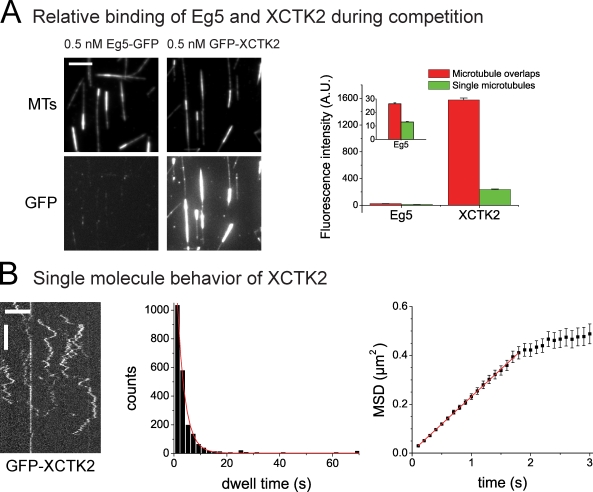 Figure 3. Comparison of relative affinity of XCTK2 and Eg5 and XCTK2 single molecule characterization of XCTK2. (A) Comparative quantification of the binding of GFP-XCTK2 and Eg5-GFP to single microtubules (MTs) and microtubule pairs (made with 0.5 nM unlabeled XCTK2) at identical conditions. (left) TIRF microscopy images of Cy5-microtubules (top) and of GFP-labeled motors as indicated (bottom) measured at identical microscopy settings for the two motors. (right) Averaged fluorescence intensities of the two GFP-labeled motors in microtubule overlaps and on single microtubules. A.U., arbitrary unit. (B) Single molecule TIRF microscopy of 0.02 nM GFP-XCTK2 on immobilized microtubules. (left) Kymographs showing binding events on an individual microtubule over time. (middle) Histogram showing the distribution of GFP-XCTK2 dwell times on microtubules and monoexponential fits (red line). The mean dwell time derived from this fit is τ = 2.86 ± 0.08 s. (right) MSD curve generated from 2,186 GFP-XCTK2 binding events and a linear fit (red line; R2 = 0.999). The initial linear increase of the MSD curve shows that XCTK2 does not move in a directional manner but diffuses via its nonmotor binding site on the microtubule. The one-dimensional diffusion coefficient D as derived from the slope of the fit (MSD = v2t2 = 2Dt) is D = 0.112 ± 0.001 µm2/s. (A and B) Stated errors and error bars are standard errors of the mean. All experiments shown were performed in assay buffer containing 50 mM KCl. Bars: (A and B [horizontal]) 5 µm; (B, vertical) 5 s.