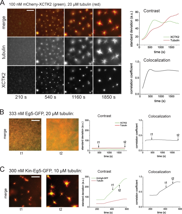 Figure 4. Self-organization of microtubules and mitotic kinesins. (A) Self-organization of microtubules and XCTK2: time course of the formation of microtubule asters in the presence of 100 nM mCherry-XCTK2 and 20 µM tubulin. (left) Epifluorescence images of mCherry-XCTK2 and Cy5-tubulin taken at the indicated times in the individual color channels and as merged images. (right) Time course of organization monitored by image parameters: total contrast (top) for mCherry-XCTK2 images (green) and Cy5-microtubule images (red) as calculated by the standard deviation from the mean; colocalization (bottom) of mCherry-XCTK2 and Cy5-microtubule signals as calculated by Pearson’s correlation. (B) Self-organization of microtubules and Eg5. (left) Early (t1) and late (t2) example images illustrating the development of self-organization with Eg5-GFP (green) and Cy5-microtubules at the concentrations indicated. (right) The time course of self-organization is monitored by the standard deviation, which is indicative of contrast (left), and Pearson’s correlation coefficient, which is indicative of colocalization (right), for the color channels as indicated. The time points of the example images to the left are indicated in the curves with arrows. (C) Self-organization of microtubules and chimeric Kin-Eg5. Composition of the figure is as described in B. All experiments were performed in assay buffer with 50 mM KCl. a.u., arbitrary unit. Bars, 50 µm.