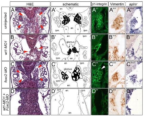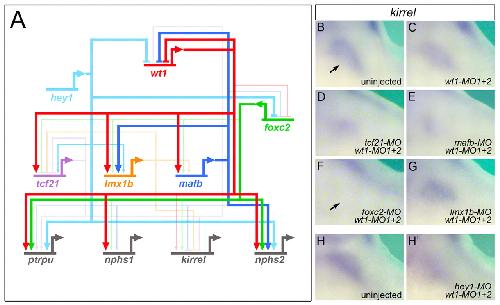 ???displayArticle.abstract??? Podocytes are highly specialized cells in the vertebrate kidney. They participate in the formation of the size-exclusion barrier of the glomerulus/glomus and recruit mesangial and endothelial cells to form a mature glomerulus. At least six transcription factors (wt1, foxc2, hey1, tcf21, lmx1b and mafb) are known to be involved in podocyte specification, but how they interact to drive the differentiation program is unknown. The Xenopus pronephros was used as a paradigm to address this question. All six podocyte transcription factors were systematically eliminated by antisense morpholino oligomers. Changes in the expression of the podocyte transcription factors and of four selected markers of terminal differentiation (nphs1, kirrel, ptpru and nphs2) were analyzed by in situ hybridization. The data were assembled into a transcriptional regulatory network for podocyte development. Although eliminating the six transcription factors individually interfered with aspects of podocyte development, no single gene regulated the entire differentiation program. Only the combined knockdown of wt1 and foxc2 resulted in a loss of all podocyte marker gene expression. Gain-of-function studies showed that wt1 and foxc2 were sufficient to increase podocyte gene expression within the glomus proper. However, the combination of wt1, foxc2 and Notch signaling was required for ectopic expression in ventral marginal zone explants. Together, this approach demonstrates how complex interactions are required for the correct spatiotemporal execution of the podocyte gene expression program.