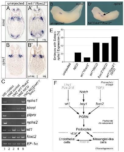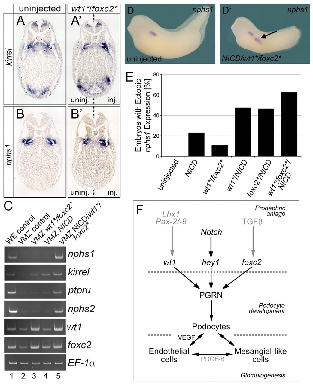 Fig. 7. wt1, foxc2 and NICD are sufficient to activate podocyte gene expression. (A-Bâ²) Transverse sections of whole-mount in situ hybridizations comparing kirrel (A,Aâ²) and nphs1 (B,Bâ²) expression in wt1* plus foxc2* mRNA-injected Xenopus embryos (Aâ²,Bâ²) and uninjected sibling controls (A,B) at stage 35. Injected and uninjected sides are indicated. (C) RT-PCR analysis comparing the expression of podocyte terminal differentiation genes nphs1, kirrel, ptpru and nphs2 and the transcription factors wt1 and foxc2 in uninjected whole embryos (WE control, lane 1), uninjected ventral marginal zone explants (VMZ control, lane 2) or ventral marginal zones injected with wt1* plus foxc2* mRNA (VMZ wt1*/foxc2*, lane 3), with NICD mRNA (VMZ NICD, lane 4), or co-injected with NICD, wt1* and foxc2* mRNA (VMZ NICD/wt1*/foxc2*, lane 5). (D,Dâ²) Whole-mount in situ hybridization of control embryos (D) and embryos co-injected with NICD, wt1* and foxc2* mRNA (Dâ²) for nphs1 expression at stage 35. Arrow indicates an ectopic patch of nphs1 expression. (E) Quantification of ectopic nphs1 patches in embryos injected with wt1*/foxc2*, NICD, wt1*/NICD, foxc2*/NICD and wt1*/foxc2*/NICD mRNA. (F) Schematic of Xenopus glomus development. The three transcription factors, wt1, foxc2 and hey1, activate the PGRN (podocyte gene regulatory network). Subsequently, differentiated podocytes secrete Vegf to recruit endothelial cells and mesangial cells to form the differentiated glomus (see Discussion for further details).