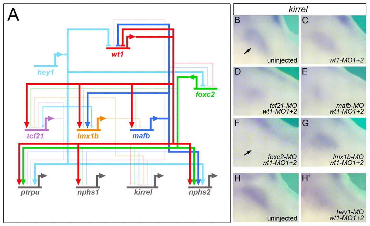 Fig. 4. wt1 and foxc2 are key regulators of the podocyte gene regulatory network. (A) Wire diagram combining the data for the individual knockdowns of the six podocyte transcription factors, showing all the connections. Note that none of the interactions is necessarily direct and might involve intermediary players. (B-G) Whole-mount in situ hybridization for kirrel mRNA expression in uninjected control embryos (B) and Xenopus embryos injected radially with wt1-MO1+2 alone (C) and in the presence of tcf21-MO (D), mafb-MO (E), foxc2-MO (F) or lmx1b-MO (G). (H,Hâ²) kirrel expression in a Xenopus embryo injected unilaterally with wt1-MO1+2 and hey1-MO showing the uninjected (H) or injected (Hâ²) side.