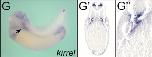 Fig. 1. Spatiotemporal expression of podocyte genes. (A-Aâ²) Schematics depicting the glomus (black) in whole Xenopus embryos (A) and in transverse section at low (Aâ²) and high (Aâ²) magnification at stage 35. (B-Jâ²) In situ hybridization of podocyte transcription factors wt1 (B-Bâ²), foxc2 (C-Câ²), tcf21 (D-Dâ²), mafb (E-Eâ²) and lmx1b (F-Fâ²) and of markers of podocyte differentiation kirrel (G-Gâ²), nphs1 (H-Hâ²), ptpru (I-Iâ²) and nphs2 (J-Jâ²) at stage 35 in whole-mounts (B-J) and transverse sections (Bâ²-Jâ²). (K) Temporal profile of podocyte gene expression in the glomus. en, endoderm; g, pronephric glomus; lpm, lateral plate mesoderm; no, notochord; nt, neural tube; so, somites; t, pronephric tubules.