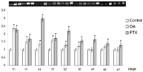 Franchini, Expression of the genes siamois, engrailed-2, bmp4 and myf5 during Xenopus development in presence of the marine toxins okadaic acid and palytoxin. 2009, Pubmed , Xenbase