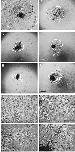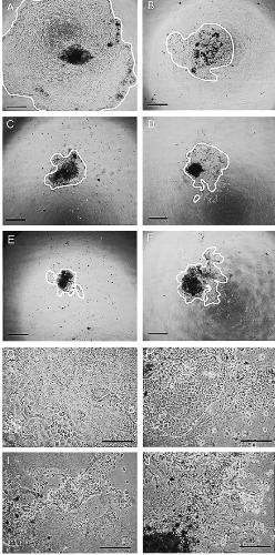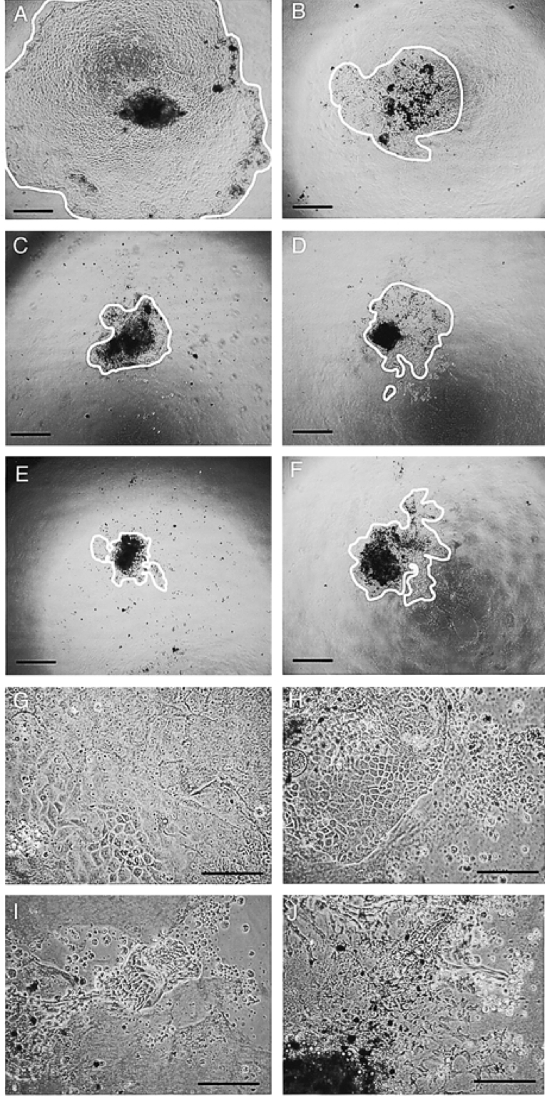 Fig. 1. Phase-contrast photomicrograph of primary culture of an animal cap on collagen gel on culture day 14. Primary culture in (A) medium designated RDX, (B) 55% RD, (C) 55% Dulbecco’s modified Eagle medium (DMEM), and (D) 55% RPMI 1640, in a humidified atmosphere of 5% CO2 at 20C. (E) Primary culture in Steinberg’s solution, and (F) 60% Leibovitz's L15 medium in a humidified atmosphere of normal air at 20C. The area inside the white line indicates the colony margin of the primary culture. Bars, 1 mm (G) Enlarged photograph of the mi- grated cells in RDX, (H) 55% RD, (I) Steinberg’s solution, and (J) 60% L15. Bars: 100 μm.