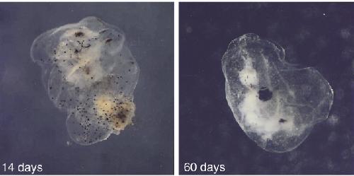 Fig.2. External morphology of the sandwich explants. The ani- mal cap treated with 100 ng/mL activin A was sandwiched with two untreated animal caps, and then cultured in RDX for 60 days.