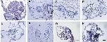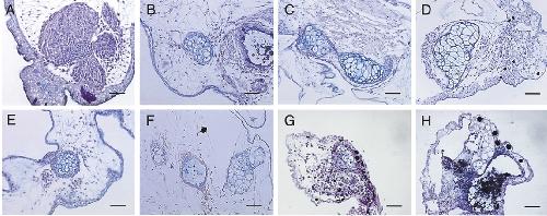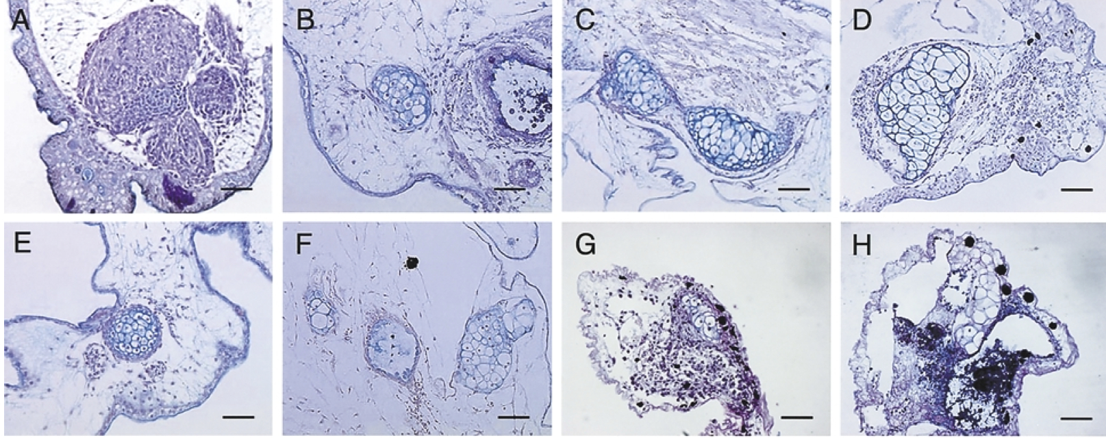 Fig 3. Alcian blue and periodic acid-Schiff (PAS) staining of the explants. Paraffin sections of the formalin-fixed explants cultured for 2 months were stained with Alcian blue and PAS solution. (A) Explant cultured for 4 days in RDX; (B) explant cultured for 7 days in RDX; (C) explant cultured in RDX for 14 days; (D) explant cultured in RDX for 2 months; (E) explant cultured in Steinberg's solution (SS) for 7 days; (F) explant cultured in SS for 14 days (tissues intact); (G) explant cultured in SS for 14 days (tissue necrosis observed); and (H) explant cultured in SS for 2 months.