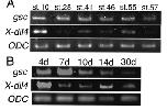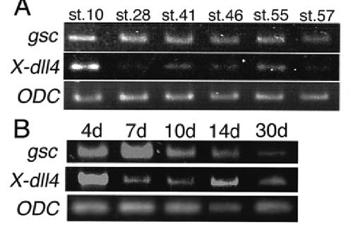 Fig. 6. Expression of X- dll4 and gsc in tadpoles and the explants cultured in RDX. Expression of X- dll4, and gsc in the explants cultured in RDX on days 4, 7, 14, and 30, and in tadpoles at stages 41, 46, 55, 57, using the reverse transcription polymerase chain reaction (RT–PCR) method. (A) RNA was extracted from tadpoles at stages (st.) 10, 28, 41, 46, 55, and 57. (B) RNA was extracted on days (d) 4, 7, 10, 14, 21, and 30 from the explants cultured in RDX.