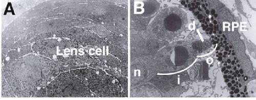 Fig 2. Mature, differentiated cells of the retina and lens were observed in the eye induced in vitro. Electron microscopy of the in vitro eye. Mature lens (A) and photoreceptor cells (B) are present in the eye induced in vitro. d, disc membrane; i, inner segment; n, nucleus; o, outer segment. |