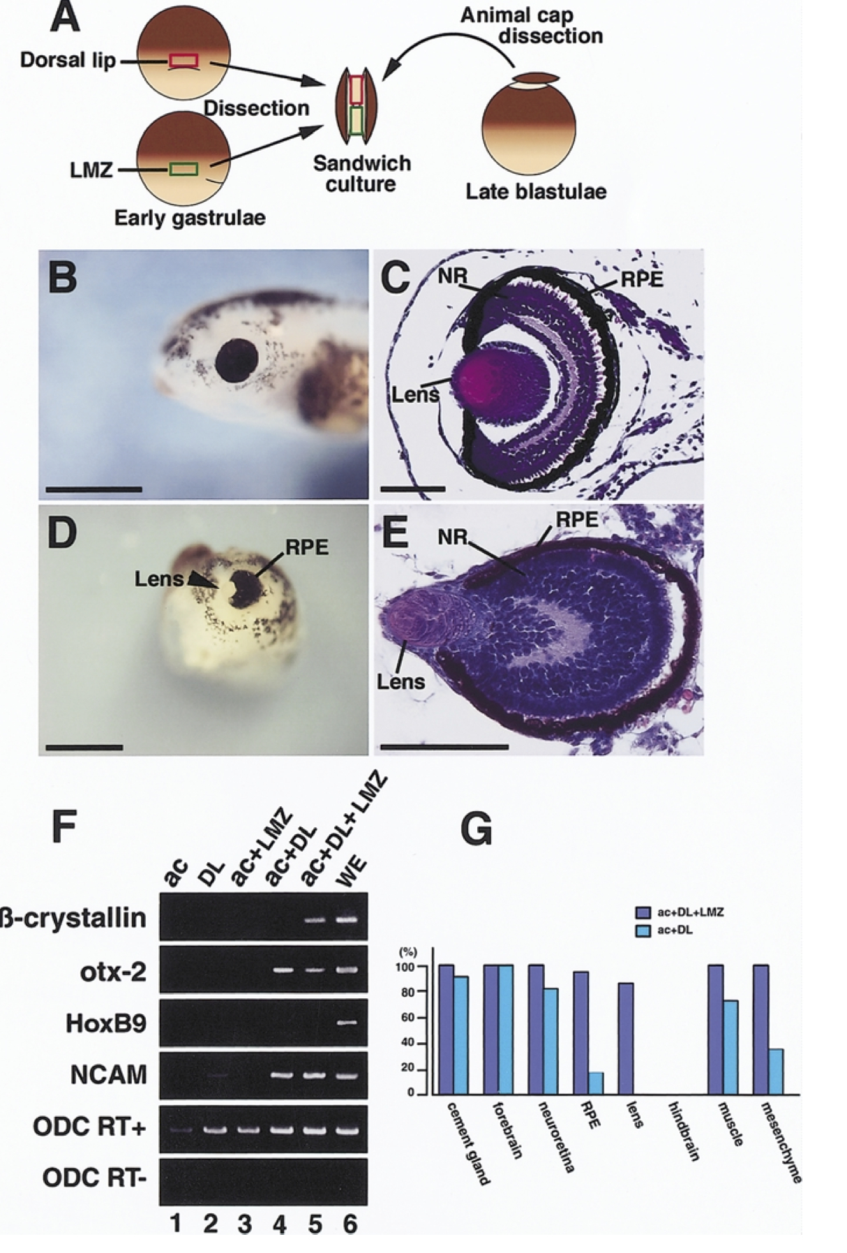embryo. (G) Bar graph summarizes the results from the observation of tissue differentiation. Neuroretina, RPE, and lens were observed frequently in the sandwich-explants combining the dorsal lip and LMZ cells. |
