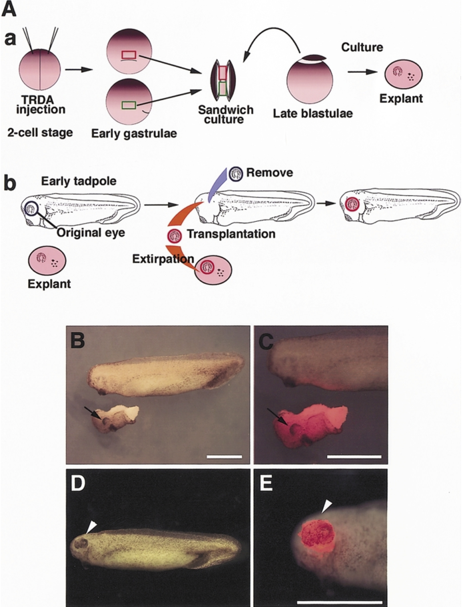 Fig. 4. The eye formed in vitro was transplanted into stage33 tadpoles. (A) Schematic dia- grams of lineage labeling (a) and transplantation (b). The 2-cell stage embryos were injected with 8 nL of 0.5% Texas red-dextran- amine (TRDA) at the animal pole. Using these embryos, the eye was induced and cultured until early tadpole stage (stage 33) (a). The left eye was surgically removed from the recipient tadpole (stage 33), and the eye formed in vitro was extirpated from the explant and transplanted into the tadpole (b). (B) External views of the recipient stage 33 tadpole (top) and the donor explant (bottom). Black arrow indicates eye induced in vitro. (C) Magnified view of B. TRDA signal (red fluorescence) was observed in the explant only. (D,E) Tadpole showing the trans- planted in vitro eye. (D) The graft was inserted at the position of the original eye. (E) Red fluorescence could be observed at the grafted eye. White arrowhead indicates the grafted eye. Scale bar indi- cates 1 mm (B,C,E). |