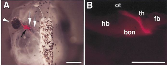 and the labeled optic nerve reached the tectum of the host brain. fb, forebrain; hb, hindbrain; ot, optic tectum; th, thalamic visual center; bon, basal optic nucleus. Scale bar indicates 1 mm (A, B). |