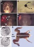 Fig. 5. The grafted eye formed in vitro connected to the recipient and this eye was retained after metamorphosis. (A) Dorsal view of the recipient 15days post- transplantation. The grafted eye was observed at the left side of the recipient (white arrowhead). (B) Lateral view of the recipient. RPE and lens could be seen. (C) High magnification view of A showing TRDA signal (red fluor- escence) on the grafted eye. Note that the optic nerve extended from the grafted eye; the white arrow indicates TRDA signal corresponding to the extending optic nerve. on, optic nerve; tn, trigeminal nerve. (D) TRDA- labeled animal caps were trans- planted into the tadpoles at stage 33 as a negative control for the transplantation procedure. Eye structures were not induced in these grafted tissues (white arrowhead). (E,F) Electron micro- scopy of the optic nerve of normal eye (E) and the transplanted eye (F). The optic nerve extending from grafted eye had the same structure as a normal optic nerve. son, sheath of optic nerve; ra, retinal axon. (G) External view of a juvenile frog. After metamorph- osis, the grafted eye bonded with the host frog. Black arrowhead indicates the transplanted eye (left side of the frog), suggesting that the grafted eye connected to the host tadpole after meta- morphosis. Scale bar indicates 1 mm (A-D). |