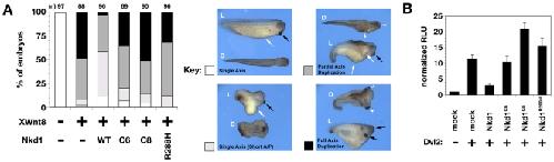 Figure 2. Wild-type Nkd1 but not mutant Nkd1 inhibits Wnt/β-catenin signaling.(A) % Xenopus embryos with indicated axis phenotype after injection of XWnt8+/âwild-type or mutant NKD1. (n)â=â# embryos injected. Panels at right show representative lateral (L) and dorsal (D) views of embryos scored as single axis (white), short A/P axis (light gray), partial axis duplication (dark gray), and full axis duplication (black) according to the Materials and Methods. In embryos with single axis in the left panels, note trunk (white arrow) and cement gland (black arrow). Arrowheads designate each axis in embryos with axis duplications (right panels). Embryos with partial axis duplication have duplicated trunktissue but a single cement gland, while embryos with full axis duplication have duplicated trunk tissues and cement glands. (B) Normalized TOPflash luciferase activity (RLU) in HEK-293 cells transfected with reporter +/âDvl2 +/â indicated Nkd1 construct.