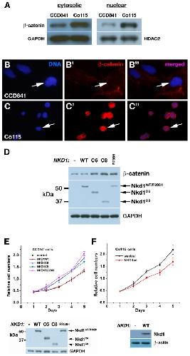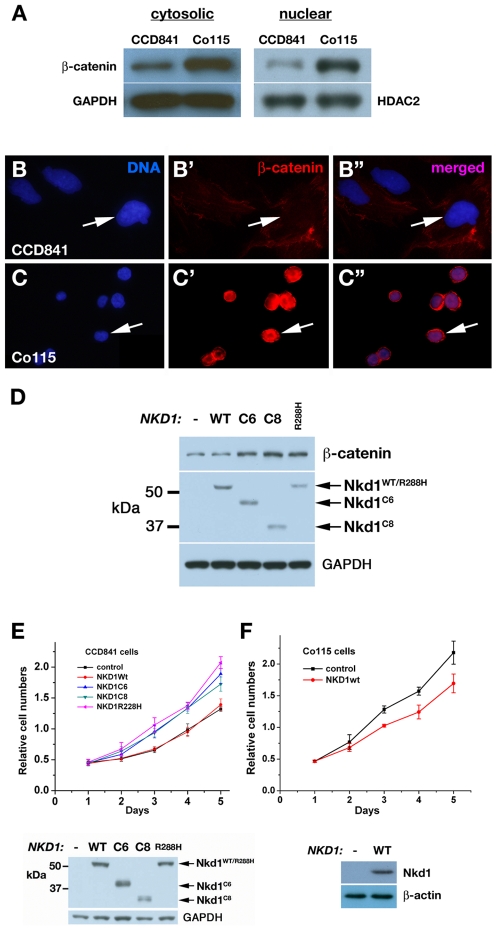 Figure 3. Effect of NKD1-mutations on β-catenin and cell proliferation.(A) Western blot of cytosolic and nuclear extracts of cells with wild-type (CCD841) or mutant (Co115) NKD1. GAPDH and HDAC2 were probed as loading controls. (BâBâ³, CâCâ³) β-catenin (red) and DNA (blue) distribution in CCD841 cells (BâBâ³) and Co115 (CâCâ³) cells. Arrows designate nuclei. Merged images in Bâ³ and Câ³. (D) Western blot of cytosolic extracts of HEK-293 cells transfected with lacZ control (-), wild type Nkd1 (WT), or indicated mutant Nkd1 construct, and probed for β-catenin, Nkd1, and loading control GAPDH. Note that each mutant Nkd1 but not wild type Nkd1 increases β-catenin levels. (E) Relative cell number as a function of days post retroviral infection of CCD841 cells with empty vector control, wild type Nkd1, or indicated Nkd1 mutant (pâ=â0.016, 0.012, and 0.0091 for C6, C8, and R288H mutants as compared to control) (F) Relative cell number as a function of days post retroviral infection of Co115 cells with control or wild-type Nkd1 (pâ=â0.022). α-Nkd1 western blots of cell extracts, with GAPDH or β-actin loading control, are shown below each plot in E and F.
