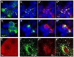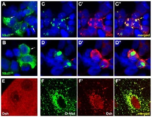 Figure 4. Nkd1 truncation alters subcellular localization and Dvl colocalization.(A, B) HEK-293 cells expressing HA/Flag-tagged Nkd1 (A) or Nkd1C8 (B) stained with α-HA (green). Nkd1 accumulates in puncta (arrows), while Nkd1C8 is diffusely distributed in the cytoplasm. Nkd1C6 distributed in a pattern similar to Nkd1C8 (not shown). (C, D) Cells co-expressing Dvl3 and wild-type (C) or C8 (D) Nkd1GFP constructs. Nkd1-GFP (green, C) shows near complete colocalization (arrows) with Dvl3 (red, C′), while Nkd1C8-GFP (D) accumulates in cytoplasmic aggregates surrounded by Dvl3 (arrows). Merged images are in C″, D″, DNA is blue in A–D. Similar results were observed in cells coexpressing Nkd1C8-GFP and Dvl1 or Dvl2, and in cells expressing Nkd1C6-GFP and Dvl1, Dvl2, or Dvl3 (not shown). (E) Salivary gland from wild-type third instar Drosophila larva stained with α-Dsh (red) showing diffuse and punctate staining. (F–F″) A8-Gal4/UAS-NkdGFP salivary gland stained with α-Dsh and imaged for GFP (F) and Dsh (F′; merged in F″). Fly NkdGFP relocalizes Dsh to perinuclear aggregates (arrows) similar to those observed with Nkd1GFP/Dvl3 in C.