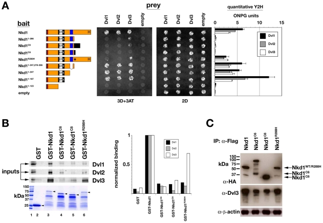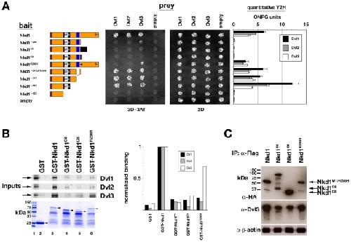 Figure 5. Mutant Nkd1 proteins exhibit reduced Dsh/Dvl associations.(A) Y2H between Nkd1-baits and Dvl-prey assayed for growth on triple dropout (3D+3AT) or double dropout (2D) media. Bar graphs on right show ONPG units from quantitative Y2H assay. Western blot indicates that Nkd1 mutant proteins are of comparable abundance (not shown). (B) GST-pulldown assay of in vitro translated, 35[S]-labelled Dvl1-3 with each GST-Nkd1 protein. Bar graph is quantitative band intensity. Coomassie-stained gel shows each GST-fusion protein, with arrowheads indicating full-length proteins. (C) Western blots of Flag-IPs from HEK-293 cell extracts with equal amounts of each HA/Flag-tagged Nkd1, and then probed with α-HA (upper) and α-Dvl3 (middle). β-actin is loading control (lower). Note that less Dvl3 is IP'd by Nkd1C6 or Nkd1C8 as compared to full-length Nkd1. No co-IP was observed between wild-type or mutant Nkd1s and Dvl1 or Dvl2, reminiscent of the lack of stable co-IP between Drosophila Nkd and Dsh [13].