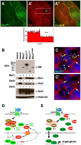 Figure 6. Mutant Nkd1s do not limit the abundance of Dsh/Dvl as well as wild type Nkd1.(AâAâ³) 71B-Gal4/UAS-NkdGFP third-instar Drosophila salivary gland stained with α-Dsh and imaged for GFP (A) and Dsh (Aâ²) distributions (merged image in Aâ³). Quantitation of Dsh pixel intensity (white box in Aâ²) reveals reduced staining in cell expressing more (right, green asterisk) NkdGFP than in adjacent cell expressing less NkdGFP. (B) Western blots of HEK-293 cells transfected with indicated Flag/HA-tagged Nkd1 and Dvl1, Dvl2, or Dvl3 constructs probed with α-HA, α-Dvl1-3, and α-βtubulin as a loading control. Each of the Dvl1-3 blots was loaded with equal amounts of extract, as confirmed by probing each blot with α-βtubulin. (C) HEK-293 cells co-expressing Nkd1GFP and Dvl1, stained with α-Dvl1, and imaged for GFP (green), Dvl1 (red), and DNA (blue) showing fine punctate Dvl1 distribution in cells expressing low to absent Nkd1GFP (white arrow). In adjacent cells expressing Nkd1GFP, Dvl1 is relocalized to Nkd1GFP/Dvl1 aggregates (yellow arrow), with loss of fine punctate Dvl1 staining (arrowheads). (D, E) Models of Nkd function in Drosophila (D) and NKD1-mutant CRC (E). Double lines: upperâ=âplasma membrane; lowerâ=ânuclear membrane. (D) Fly Wg(Wnt) binds Fz/Arrow(Lrp5/6) receptors, which inhibits the Apc/Axin/CK1/GSK3β complex that promotes degradation of Arm(β-catenin). Arm complexes with Pan(TCF) to activate target genes including nkd. Nkd promotes Dsh turnover to partially inhibit signaling, and employs the nuclear import factor Imp-α3 to enter the nucleus and further inhibit signaling through unknown mechanisms [31]. (E) In NKD1-mutant CRC, the mutant Nkd1 protein no longer binds and promotes Dvl turnover, stabilizing β-catenin and activating TCF-dependent transcription of target genes.